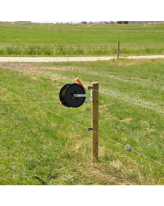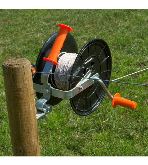 Een degelijke haspel met blokkeringspal voor het op- en afdraaien van kunststofdraad. Geschikt voor maximaal 500 meter Vidoflex, 200 meter lint of 200 meter Cord. Voorzien van geïsoleerde handgreep.