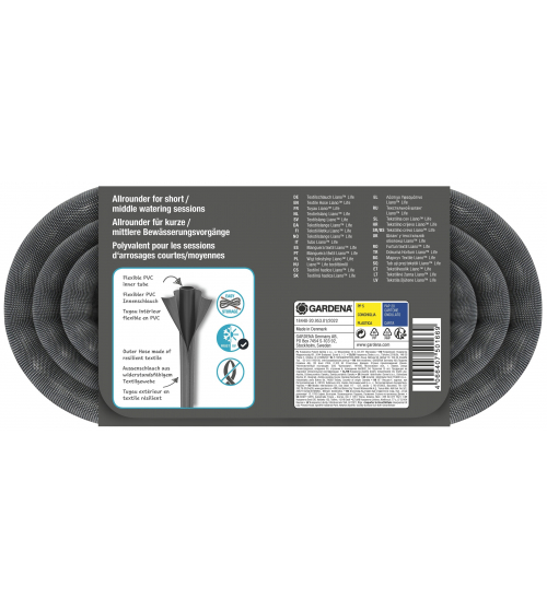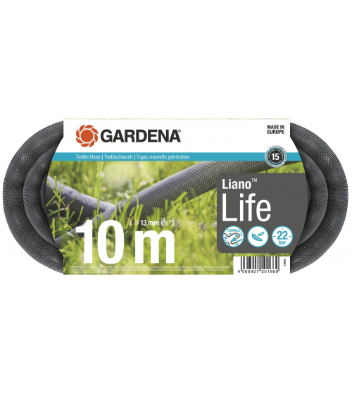 De Textielslang Liano™ Life 10 m van GARDENA is ideaal voor korte en middellange bewatering en kan veelzijdig gebruikt worden in kleine tuinen of op balkons. Dankzij de voorgemonteerde Original GARDENA System-accessoires Liano™ Slangstuk en Liano™ Waterstop kan de slang met een diameter van 13 mm (1/2") snel ingezet worden. De flexibele PVC-binnenslang en de buitenslang gemaakt van bestendig textiel zorgen voor betrouwbaarheid en duurzaamheid. De Liano™ Life heeft een uitstekende flexibiliteit, wat helpt bij het bewateren van de tuin of schoonmaken rond het huis. Zijn uitstekende elasticiteit maakt het veel makkelijker om hem te verplaatsen en de slang over de vloer te slepen. Hij blijft minder snel haken achter obstakels en knikt niet. Hij is tot 50 % lichter dan gebruikelijke PVC-slangen en dus kan je hem lange periodes comfortabel in je handen houden, zelfs langere tijd. Daarnaast is zijn aangename oppervlak comfortabel in gebruik. Ook is de Liano™ Life makkelijk op te bergen, doordat hij makkelijk en compact in de beschikbare opbergruimte past. De tuinslang is bestand tegen een maximale druk van 22 bar. Dankzij de uv- en vorstbestendigheid kan hij het hele jaar door buiten blijven. De Liano™ Life is vrij van schadelijke stoffen zoals ftalaten (0,1%), maar ook cadmium, lood en barium (0,1%). De Textielslang Liano™ Life is een in Europa gemaakt kwaliteitsproduct, die wordt gedekt door een lange fabrieksgarantie van 15 jaar door GARDENA, na een online registratie.
