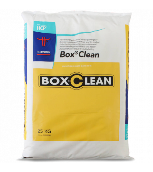 Boxclean is een strooimiddel dat onverdund wordt toegepast voor de pleksgewijze desinfectie van vochtige grondoppervlakken in stallen, ligboxen, kalverhokken en afkalfstallen.