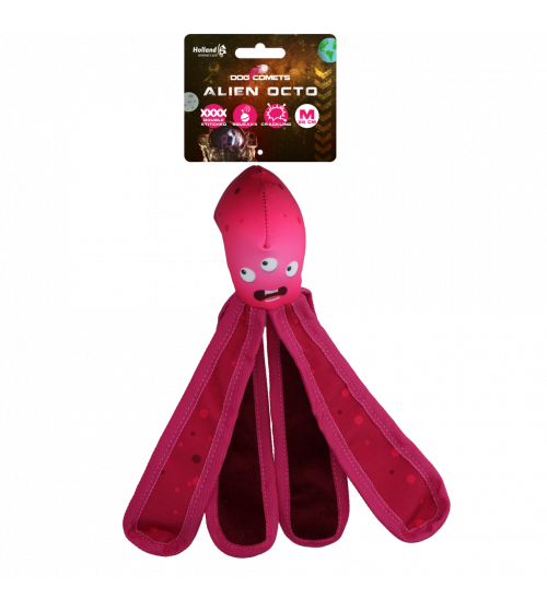De Dog Comets Alien Octo is op aarde geland! Dit buitenaardse vriendje neemt elke hond graag mee op avontuur. De Alien Octo heeft een pieper in het hoofd en knisperende tentakels voor extra stimulans en plezier tijdens het spelen. Het speeltje drijft ook nog eens op water, waardoor het ideaal is voor honden die graag in het water spelen. Dankzij het stevige canvas en de dubbelgestikte naden gaat dit speeltje lang mee. Kies uit 3 verschillende kleuren, elk met een grappige gezichtsuitdrukking!