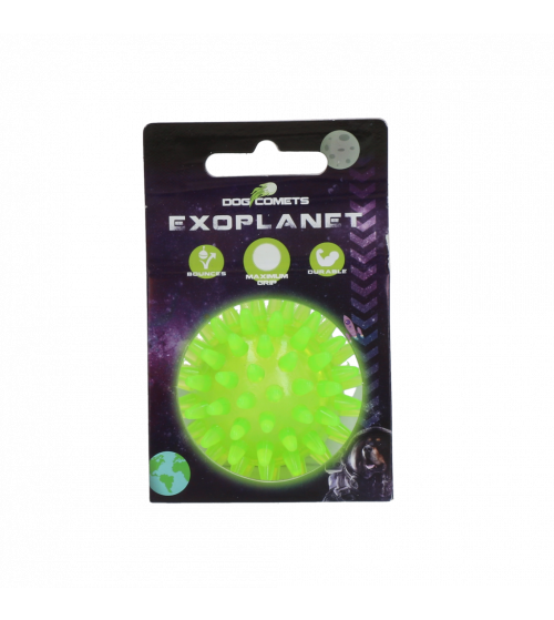 Deze bal vol met stevige maar flexibele 'stekels' zorgt voor urenlang speelplezier en helpt tegelijkertijd het gebit te reinigen! De Dog Comets Exoplanet stuitert perfect, drijft op water en is dankzij de stekels makkelijk vast te pakken. Deze eigenschappen zorgen ervoor dat de bal erg geschikt is voor het apporteren en om mee te spelen in het water. Als de hond de bal in de bek vastpakt, dan masseren de stekels het tandvlees en ze helpen de tanden te reinigen. De pieper in het midden zorgt voor extra stimulans tijdens het spelen.