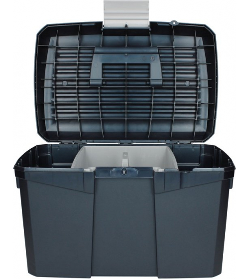 Ruime poetsbox van polypropyleen met een inzetbakje en een uitneembare houder voor de hoefolieborstel. Door de verstevigde deksel is de poetsbox te gebruiken als zitkrukje of opstapje. De poetsbox is afsluitbaar met een hangslot (niet bijgeleverd). Afmetingen: 40 x 27.5 x 24.5 cm (l x b x h).+++