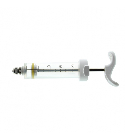 Nylon gegoten injectiespuit met gegraveerde schaalverdeling met twee type naald aansluitdelen. Schroef en Luerlock aansluiting. - Bestand tegen kokend water en sterilisatie in een autoclaaf tot 134 ° C (30 min - 1,5 bar). - Binnenstang vernikkeld koper - Vlakke siliconen ringen afgeschuind, extra sterk. - Soepel glijden van de zuiger. - Vernikkelde messing aansluitdeel schroef en luerlock. - Verkrijgbaar in 10ml, 20ml, 30ml en 50ml. - Na ieder gebruik de spuit schoonspoelen met water en steriliseren. - Na sterilisatie de zuigerring in olien met siliconenolie.