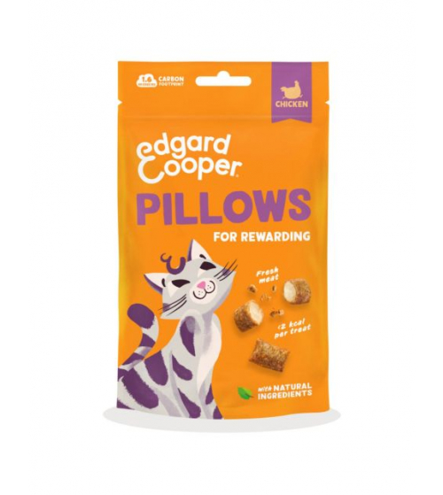 Met onze overheerlijke Pillow snacks beloon je alles wat zalig is aan katten. Omdat ze je zetel niet als krabpaal gebruiken, omdat ze spontaan in hun reismand springen of gewoon omdat ze zo schattig zijn. Pillows zijn de verdiende beloning voor poeslief gedrag. Een zachte, rrromige vulling in een krokant jasje. Wedden dat je kat deze verrassende textuur onweerstaanbaar vindt? Boordevol lekker verse kip en natuurlijke ingrediënten - zonder granen of toegevoegde suiker. En met minder dan 2 kcal per snack mag je je kat gerust nog een keer belonen, en nog eens en nog eens. Het resultaat? Een gelukkige kat die zich helemaal thuisvoelt en super close is met jou.Ideaal voor katten vanaf 6 maanden.