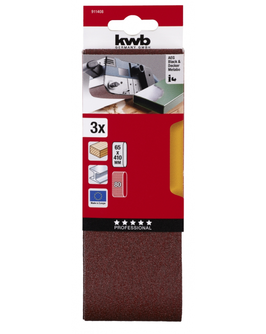 kwb Schuurbanden, hout en metaal, edelkorund, 65 x 410 mm -- Schuurbanden, edelkorund met aluminiumoxide bestrooid, gebonden met volledig synthetisch hars, drager van zwaar, zeer elastisch katoen, speciale verlijming, ratel- en fladdervrije verbinding.