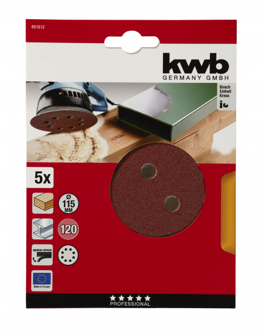 kwb Schuurschijven, hout en metaal, edelkorund, Ø 115 mm, geperforeerd Quick stick -- Schuurschijven, Ø 115 mm, HOUT & METAAL, edelkorund, met aluminiumoxide bestrooid, gebonden met volledig synthetisch hars, versterkt dragermateriaal, met velours rug, geperforeerd, voor excentrische schuurmachines, voor het schuren van metaal, hout, verf, lak, plamuur, steen en kunststof.