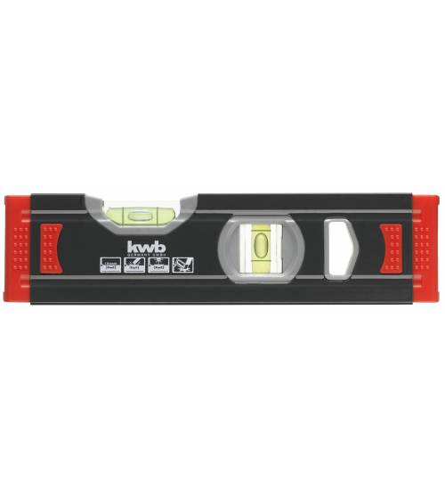 Hoogwaardige miniwaterpas van aluminium, randen van slagvast kunststof, met 2 waterpassen in acrylglas voor horizontale en verticale metingen op plaatsen waar de ruimte beperkt is, met verzinking en V-groef aan de onderkant van de waterpas voor metingen op ronde oppervlakken zoals kabelgoten of koperen buizen, meetnauwkeurigheid +/- 1 mm/m.