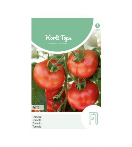 Tomaat - Pyros F1 Vanaf eind februari in een zaaibakje bij 20ºC of later buiten onder glas. Na verspenen, in een kasje of in potten uitplanten. Pyros is een middelvroeg ras met goede ziekteresistentie en geeft ronde vruchten van ca. 130-150 gram; geschikt voor buitenteelt.