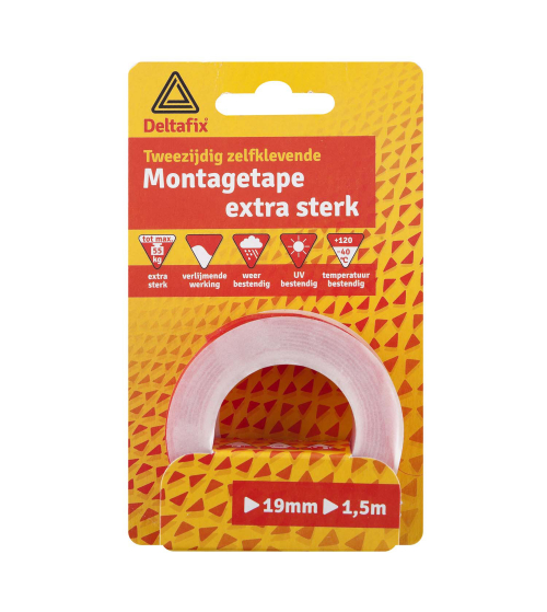 Tweezijdig zelfklevende montagetape extra sterk is ontwikkeld voor het permanent bevestigen van voorwerpen, zowel binnen als buiten. Deze tape kan gebruikt worden in plaats van andere bevestigingsmethoden zoals spijkeren, lassen en lijmen. De tape kan tegen extreme temperaturen en is bovendien geschikt voor het bevestigen op metaal, hout, glas en vele soorten plastic. Een gladde, niet-poreuze ondergrond geeft het beste resultaat.- tot maximaal 55 kg- verlijmende werking- weerbestendig- uv-bestendig- temperatuurbestendig (-40°C - 120°C)