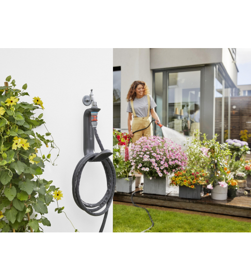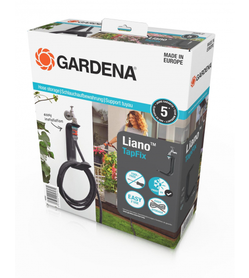 De TapFix slanghouder voor de Liano™ textielslang van GARDENA kan snel en gemakkelijk aan vrijwel iedere waterkraan (G1", G3/4" en G1/2”) worden bevestigd, zonder gaten te boren en zelfs zonder gereedschap! Dankzij het slimme ontwerp hoef je geen gaten in muren te boren om de slanghouder te bevestigen. Deze oplossing is eenvoudig en beschadigt niets. De handige oplossing is ideaal om de Liano™ textielslang van GARDENA op te bergen en kan gemakkelijk een slang van 20m bevatten. Er moet minimaal 50cm ruimte zijn tussen de kraan en de grond. De Liano™ TapFix slanghouder en Liano™ textielslang kunnen dankzij de innovatieve uv- en vorstbestendigheid het jaar rond buiten op de kraan blijven hangen. Als je de TapFix slanghouder en Liano™ textielslang in de wintermaanden toch binnen wilt opbergen, kunnen ze dankzij het gat aan de achterkant van de TapFix eenvoudig in de kelder of garage worden opgehangen. GARDENA biedt een fabrieksgarantie van vijf jaar op de Liano™ TapFix slanghouder.