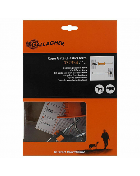 Complete doorgangsset (geleidend elastisch cord, terra) om snel en eenvoudig een doorgang in een (cord) afrastering te maken. Eenvoudig te openen en sluiten door de poortgreep in of uit de poortgreepanker te halen (bijgeleverd). Geschikt voor een doorgang van 3 tot maximaal 6 meter.