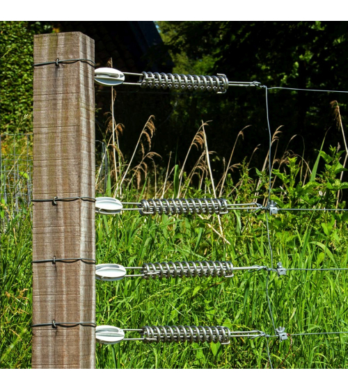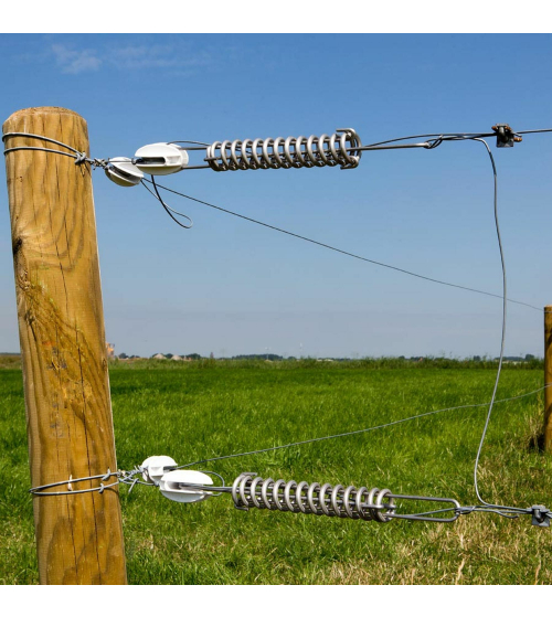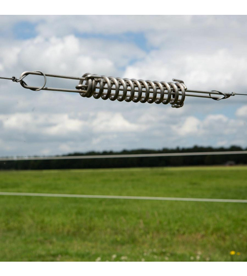 De trekveer neutraliseert het spanningsverschil in de draad ten gevolge van temperatuurschommelingen. Hierdoor blijft de draad zomer en winter even strak staan met als resultaat dat de paalafstand (tot max.15m) verdubbeld kan worden. Geschikt voor 2,5mm, 2,65mm HT en 2,5mm Permanentdraad. Maximale belasting 200kg. Roestvrijstaal, lengte 345mm. Kostenbesparend en minder onderhoud. Productgarantie: 10 jaar.