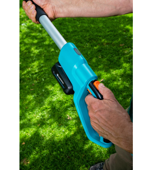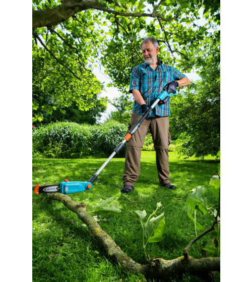 De GARDENA accu-telescopische snoeischaar TCS 20/18V P4A is handig, compact en snoeit nauwkeurig. Met een bladlengte van 20 cm en uitschuifbare telescoopsteel bereikt u takken tot wel 4m hoog - zonder te moeten klimmen of jezelf in gevaar te brengen op een zwaaiende ladder. Doordat de telescoopzaag slechts 3,5 kilogram weegt, is er gemakkelijk mee te werken. De smalle snoeikop is praktisch op twee manieren: als u hem kantelt, kunt u krappe plekken in boomtoppen bereiken. En u kunt ook takken die op de grond liggen, fijnhakken zonder te hoeven knielen of bukken. Op deze manier kunt u de stekken in een handzaam formaat krijgen en gemakkelijk weggooien. Door de zaagsteun aan de punt van het zaagblad kan u de telescoopzaag stabiel houden. U kunt er ook takken mee trekken die al van de boom zijn gezaagd, als ze niet vanzelf op de grond vallen. En last but not least: het beschermt de ketting bij het zagen in de buurt van obstakels. Als u de snoeischaar wilt vervoeren of opbergen, kunt u deze eenvoudig en zonder gereedschap in twee delen scheiden. De GARDENA accu-telescopische snoeischaar TCS 20/18V P4A wordt geleverd als een gebruiksklare set met een oplader en een 18V POWER FOR ALL-accu met een maximale looptijd van maximaal 50 minuten of 200 sneden takken met een diameter van 50 millimeter. De POWER FOR ALL ALLIANCE is een van de grootste merkoverschrijdende accu-allianties van toonaangevende fabrikanten. De accu is daarom compatibel met tal van andere gereedschappen in huis en tuin, zodat u geld bespaart en altijd flexibel blijft.
