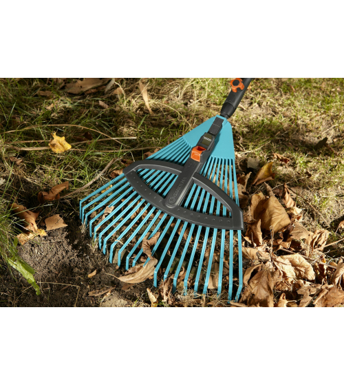 Met de GARDENA combisystem verstelbare plastic Bladhark kan je makkelijk bladeren, gemaaid gras, verticuteerresten of ander tuinafval bij elkaar harken. Dankzij de makkelijk verwisselbare accessoires is het GARDENA combisystem flexibel te gebruiken. De verstelbare Bladhark kan met alle stelen van het GARDENA combisystem worden gecombineerd en wordt bevestigd door hem op de steel te schuiven en vast te schroeven. GARDENA raadt een steel met een lengte van 130 cm aan, maar de keuze van de steel hangt ook af van de werkomstandigheden en je lichaamslengte. De betrouwbare aansluiting tussen de Bladhark en de steel zorgt ervoor dat je altijd comfortabel kunt werken. De hark is van sterk en duurzaam plastic gemaakt. Je kan de afstand tussen de flexibele plastic harktanden aanpassen en kiezen tussen een werkbreedte van 35 tot 52 cm voor fijner of groffer harken. Om ruimte bij het opbergen te besparen, kun je de combisystem Gereedschaphouder Flex (art.nr. 3505-20) gebruiken. GARDENA geeft 25 jaar garantie op de combisystem verstelbare plastic Bladhark na registratie binnen 3 maanden na aankoop op GARDENA.com/registration. Let your tool family grow. GARDENA combisystem. Verwisselbaar. Duurzaam. Voor al je tuinwerk.