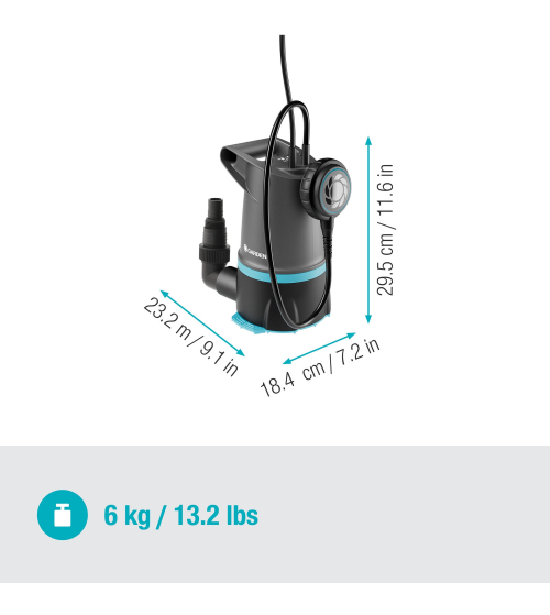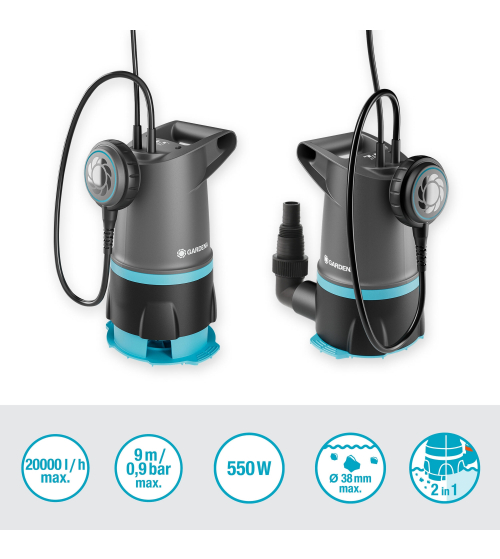 | Inhoud pakket | 1x GARDENA 2-in1- Submersible Clear/Dirty Water Pump, 1x power cable 10 m H05 RN-F |