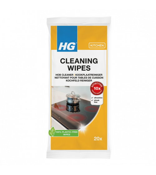 HG kookplaat wipes zijn speciaal ontwikkelde vochtige schoonmaakdoekjes om snel en eenvoudig dagelijkse vervuiling zoals vet en kookvocht van de kookplaat te verwijderen. De grote en 100% embossed viscose schoonmaakdoekjes garanderen een gemakkelijke reiniging van de kookplaat.