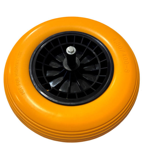 kruiwagenwiel 4.80/4.00x8, as 20cm van polyurethaan voor zachte luchtgeveerde verplaatsing. lage rolweerstand en zeer duurzaam. bandenschade als gevolg van uitdroging, uv-stralen en scheuren behoren voorgoed tot het verleden.