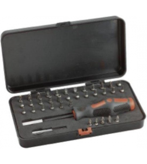 37 delige bit-schroevendraaierset met magneet-schroevendraaierset Met: 1 bitschroevendraaier, 1 bithouder 1/4? schacht, 35 bits 1/4? 25 mm. PH nr. 0, nr. 1, nr. 2 / PZ nr. 1, nr. 2 / Torx T8, T10, T15, T20, T25, T27, T30 / Binnenzeskant 2, 2,5, 3, 4, 5, 6 mm, 5/64?, 3/32?, 7/64?, 1/8?, 9/64?, 5/32? / 3-loped 1, 2, 3, 4 / 4-loped 6, 8, 10 / dubbele binnenuitsparing 4, 6, 8, 10.