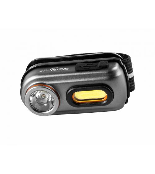 De Nebo Einstein 400 Oplaadbaar is een onopvallende, compacte oplaadbare hoofdlamp van 400 lumen. De lamp heeft 2 LED’s in 5 lichtstanden, een COB-led met brede bundel en een gerichte LED spot. De meegeleverde oplaadbare batterij zorgt voor maximaal 8 uur gebruik. De Einstein 400 is gemaakt van duurzaam ABS met een aluminium constructie, is IPX4 spatwater dicht en wordt geleverd met een flexibele verstelbare hoofdband. 5 Lichtstanden -Spot Turbo / 400 Lumen / 35 sec / 133 meter -Spot Hoog / 250 lumen / 45 min / 104 meter -Spot laag / 50 lumen / 1,75 uur / 52 meter -COB LED / 100 lumen / 1,5 uur / 14 meter -COB LED Rood / 15 lumen / 5 meter