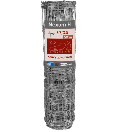De ideale oplossing om weilanden af te rasteren. Kop- en voetdraad 3,7 mm, horizontale en verticale draden 3,0 mm. Nexum Basic is voorzien van horizontale draden met een treksterkte van 700-900 N/mm². Goed corrosiebestendig dankzij zwaar verzinkte kwaliteit, zinkbedekking 255 g/m². Product conform aan de normen EN 10218-2, EN 10223-5 en EN 10244-2.