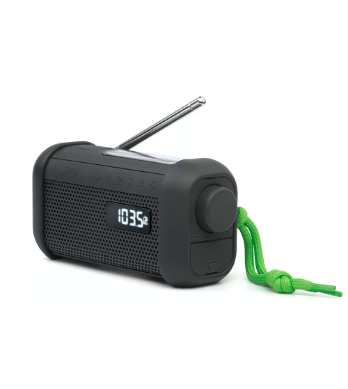 Compacte radio voorzien van FM-radio, zaklamp, noodsignaal en Bluetooth. Oplaadbaar via 230v, zonne-energie en handdynamo.