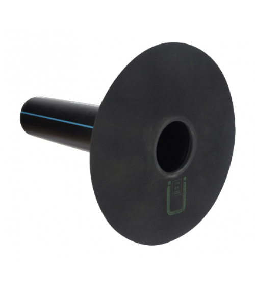 Hemelwaterafvoer rond, buis PE-kwaliteit, lengte 400 MM, slabbe afmeting 300 MM. 90° uitloop, afmeting 75 MM.
